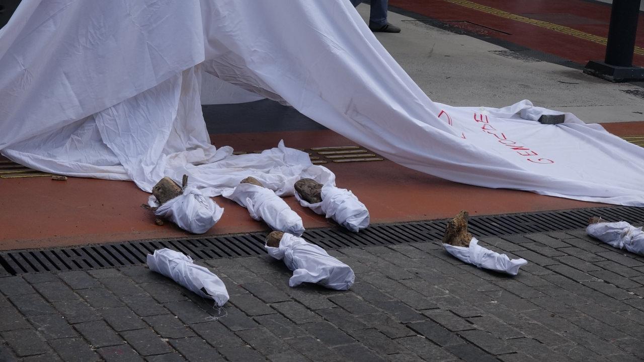 Gazze’de ölen bebeklere dikkat çekmek için kefenli eylem yaptı